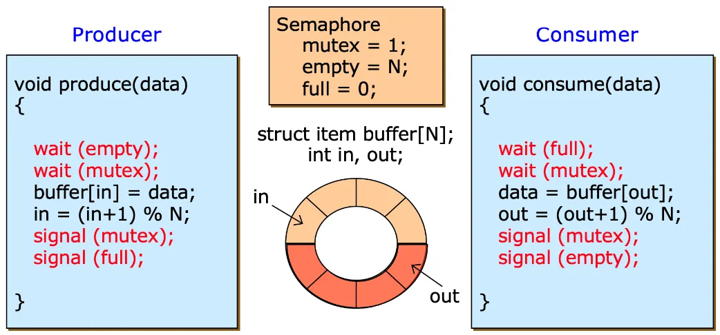 empty와 full은 카운팅 세마포어로 busy waiting을 사용하지 않도록 한다. Producer 프로세스가 큐 안에 데이터를 넣을 때 count가 N과 동일하면 busy waiting을 하도록 구현되었는데, wait(empty)를 통해 빈 공간의 개수를 의미하는 세마포어 empty의 티켓이 존재할 때만 진입할 수 있도록 한다. empty=0은 큐가 가득 찼다는 뜻이다.