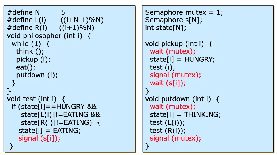 철학자가 젓가락을 가져오려면 hungry 상태가 되어야 하고, pickup을 수행할 때는 자신의 상태를 hungry로 변경하고 test를 수행한다. 왼쪽, 오른쪽의 철학자가 먹고 있는 상태가 아니면 eating으로 상태를 바꾸고 내가 먹을 수 있는지에 대한 세마포어인 s[i]를 signal로 반환한다. 그러면 pickup에 있는 wait을 수행할 수 있게 된다.