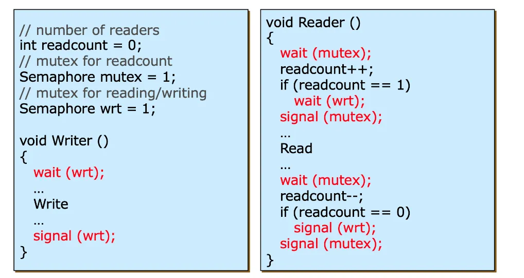 문제점: 여러 개의 동일한 프로세스들이 하나의 shared resource에 읽거나 쓰는 동작을 한다. 쓰는 작업은 mutually exclusive하게 동작해야 하지만, 읽는 작업은 여러 명이 접근해도 상관없다. Writer의 작업은 공유 자원을 오염시킬 수 있기 때문이다.