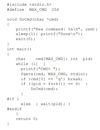 멀티 프로세스 버전에서는 fork하면 새로운 프로세스가 생성되고 부모는 wait을 통해서 기다리다가 자식이 exit을 수행하면 시그널을 받아서 wait 상태에서 빠져나오고 다시 while 루프가 수행된다.