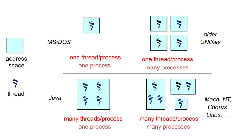 현재의 Linux, Mach 등: 대부분의 OS는 여러 개의 프로세스에 여러 개의 스레드가 존재하는 형태이다.
