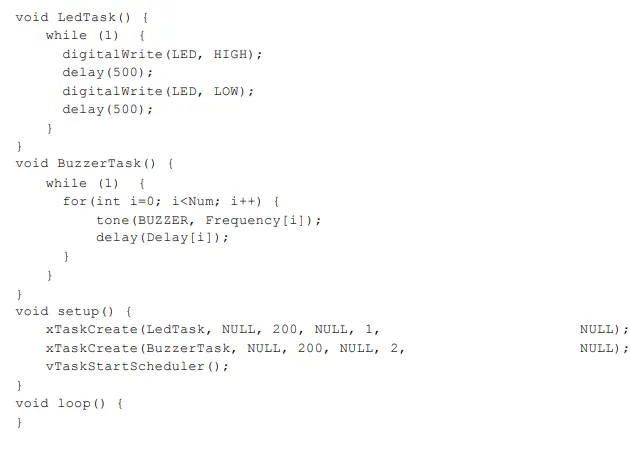 아두이노: 임베디드 장치는 제약된 하드웨어 리소스를 가진다. 운영체제도 RTOS(Real-Time OS)이며 크기가 작고 멀티 프로세스를 감당하지 못하기 때문에 멀티 스레드를 사용하는 것이 좋고 아두이노 라이브러리에서 스레드 함수를 제공한다. 사용할 수 있다. 예를 들어 LED를 깜빡이면서 버저를 울리게 만들기 위해서는 두 개의 스레드가 필요하다. 아두이노는 main에서 setup 함수를 한 번 수행하고 loop 함수를 반복 수행한다. 멀티태스크 작업할 때는 보통 루프를 비워놓는다. xTaskCreate 함수를 통해서 Task를 인자로 주고 스레드를 생성하면 동시에 동작하는 것처럼 수행된다.