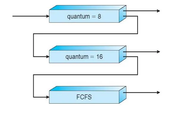 Multilevel Feedback Queue: 유닉스에서 실제로 사용하고 있는 방식이다. 프로세스가 생성되어서 레디 큐에 들어간다. 3개의 우선순위 큐가 존재하는데, RR로 동작하는 타임퀀텀이 8인 큐에 첫 번째로 들어간다. 만약 타임퀀텀 8을 다 채우지 못하고 waiting 큐로 빠진다면 짧은 시간 내에 I/O 요청을 했다는 것이고 I/O-bound 프로세스라는 것이므로 다음에도 RR을 통해 선정됐을 때 큐(타임퀀텀)=8인 큐에 들어온다. 만약 타임퀀텀을 다 쓴다면 CPU burst time이 길다는 것이므로 큐가 더 큰 큐=16에 들어가게 된다. 큐=16인 큐에서도 타임퀀텀을 다 쓴다면 FCFS로 동작하는 큐로 내려간다.
