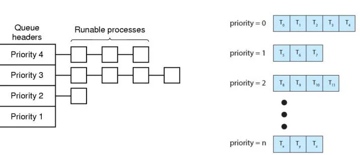 우선순위 스케줄링: 도착한 순서나 burst time이 짧은 순서보다 더 중요한 것이 존재할 수 있다. 중요한 작업을 먼저 하고 부수적인 것들은 미뤄둘 수도 있다. 따라서 프로세스마다 우선순위를 따로 부여하여 동작하도록 하는 스케줄링 알고리즘이 우선순위 스케줄링이다. 발생 가능한 문제는 우선순위가 높은 작업이 계속해서 들어오면 현재 기다리는 중인 프로세스에서 starvation이 발생할 수 있다. 따라서 Aging을 도입하여 레디 큐에 있는 시간이 길어지면 age를 증가시켜서 우선순위에 올라가서 수행될 수 있도록 한다. 우선순위 큐를 여러 개 만들고 각 큐에서는 다른 스케줄링 알고리즘을 적용할 수 있다. 우선순위가 높은 큐가 비면 그 다음 우선순위의 큐의 작업을 수행한다.