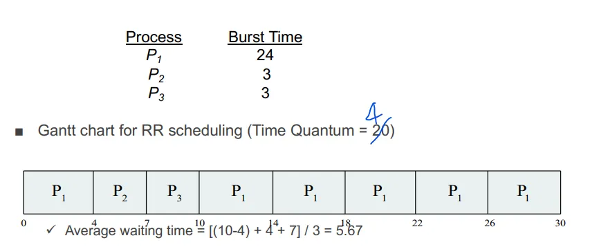 라운드 로빈 (RR): 로빈이라는 새가 돌아가면서 조금씩 먹이를 주는 것을 보고 이름 붙인 방식이다. 타임쉐어링, 멀티프로세스 개념이 적용된다. 각 프로세스는 타임퀀텀이라고 하는 단위 시간 동안 자원을 부여받는다. 시간이 지나면 선점형으로 다른 프로세스가 CPU 자원을 차지한다. 공평한 시간 동안 쓸 수 있도록 해서 fairness가 보장된다. 타임퀀텀을 아주 길게 잡으면 context switching이 발생하지 않아서 FCFS와 동일하게 동작하고 response time이 나빠진다. 타임퀀텀을 아주 작게 설정하면 유저 모드를 수행하는 시간이 줄어들고 커널의 오버헤드가 늘어나므로 trade-off를 고려해서 얼마로 타임퀀텀을 설정하느냐가 RR의 관건이다. 일반적으로 context switching에는 10ms 미만의 시간이 걸리므로 10ms~100ms가 타임퀀텀으로 적절하고, 평균적인 CPU burst 시간의 80% 정도로 설정하면 가장 좋다고 알려져 있다. 타임퀀텀이 지나면 타이머 인터럽트가 발생하고 컨텍스트 스위칭이 일어난다.
