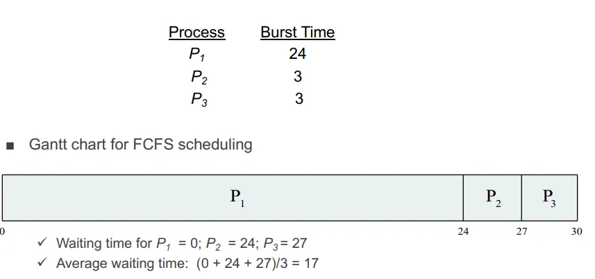 FCFS (First Come, First Served): 먼저 들어온 것을 먼저 수행시켜준다. 줄 서는 것과 비슷하다. Starvation이 없지만, 단점으로는 작은 작업이 큰 작업 뒤에 위치하면 평균 waiting time이 길어진다. 예를 들어 P1의 waiting time은 0, P2는 24, P3는 27이 된다. 하지만 burst time이 짧은 것부터 실행시키면 P2, P3, P1의 순서대로 실행되고, 그럼 평균 waiting time은 3으로 줄어든다. 이처럼 실행 시간이 긴 프로세스가 짧은 프로세스보다 앞에 있어서 waiting time이 길어지고 효율성이 하락하는 것을 Convoy Effect라고 한다. 이상적으로는 burst time이 가장 짧은 프로세스를 앞으로 보내주면 되지만, 실행되지 않은 프로세스가 얼마만큼의 실행 시간을 가질지 예측하는 것은 어렵기 때문에 현실성이 없다.