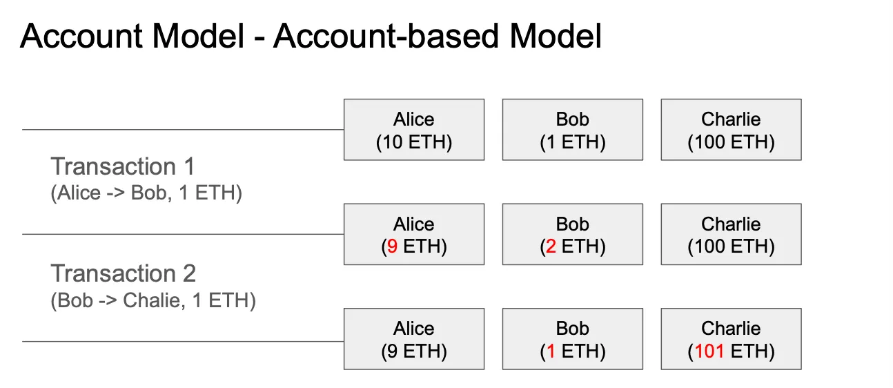 계정 방식에서 상태는 블록으로 전송되지 않고 로컬로 노드에 저장됨. 노드는 Merkle Root를 비교해서 상태에 대한 합의에 도달함. 계정기반모델은 UTXO와 다르게 코인을 분할하거나 합쳐서 트랜잭션을 발생시킬 수 있다.