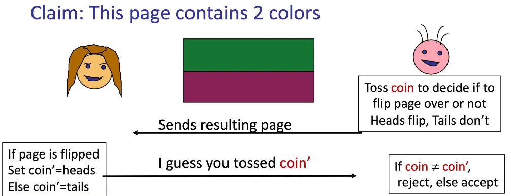 verifier가 동전을 던지고 앞이 나오면 뒤집고 뒤가 나오면 그대로 둔다. 그 결과를 prover에게 주고 뒤집혔는지 묻는다. 답이 내것과 동일하다면 두개의 페이지로 이루어져있는걸 알수있다.