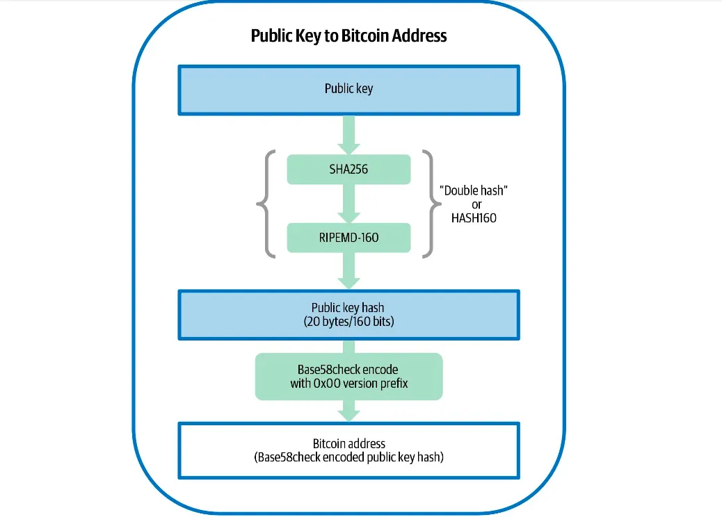 공개 키는 직접 주소로 사용되지 않고, 다음과 같은 해싱 과정을 거칩니다: