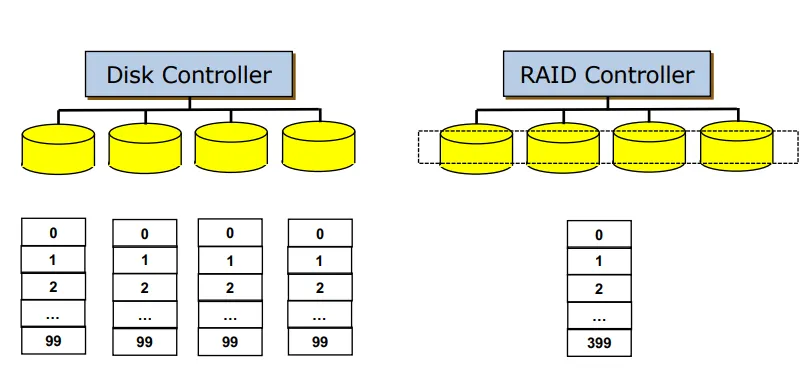RAID: Redundant Array of Inexpensive Disks. 여러 개의 디스크를 사용해서 성능과 신뢰성을 높이는 방법이다. 가격이 싼 스토리지를 여러 개 묶어서 배열로 만든다. RAID로 묶으면 여러 개의 디스크가 아니라 하나의 큰 디스크로 인식하게 된다.
