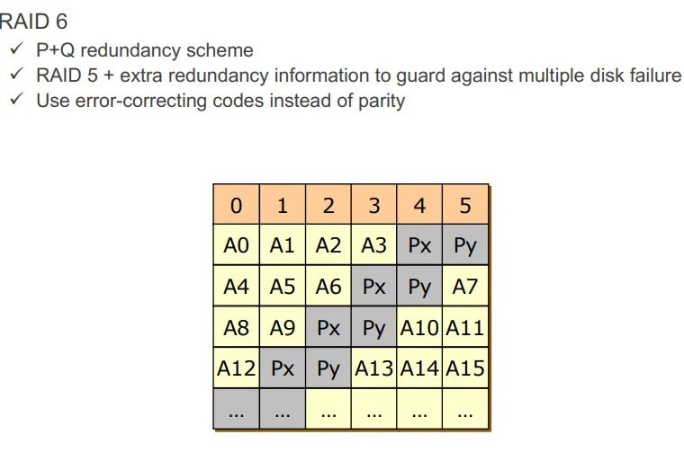 RAID 6: ECC를 사용하여 신뢰성을 더 높인다. 패리티 비트보다 디스크 용량이 2배 더 사용되어서 디스크 오버헤드가 크다. 하지만 어차피 디스크는 저렴하기 때문에 실제로 가장 많이 사용하는 방식이다. NAS에서 많이 사용한다.