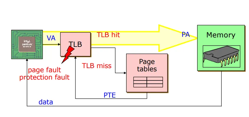 과정: CPU에서 메모리 엑세스하려고 하면 TLB를 참조하고 Cache hit이 나면 바로 메모리를 엑세스하고 Miss가 나면 페이지 테이블을 참조하여 Valid 비트라면 메모리를 엑세스하고 invalid 비트이면 운영체제가 개입해서 Protection 문제인지 Page fault인지 판단한다. Page fault라면 PCB를 참조해서 디스크에 접근하여 실제 메모리에 로드하고 페이지 테이블과 TLB를 업데이트한다.