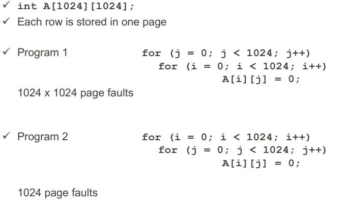 프로그램을 어떻게 짜느냐에 따라서 Page fault의 수가 크게 달라질 수 있다. 아래 예제에서 1024개의 int형 배열의 크기는 4KB이므로 페이지의 크기와 일치한다. 따라서 i, j의 순서가 바뀌는 것만으로 연속해서 데이터에 접근하는 것이 아니라 계속해서 page fault가 발생할 수 있다.