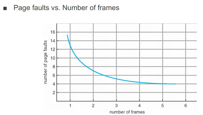 프로세스 전체를 올려놓으면 page fault가 일어나지 않고 할당받은 프레임이 많을수록 replacement가 줄어든다. 하지만 프레임 수가 5, 6개 이상이면 page-fault rate가 거의 비슷해진다. 따라서 5, 6개 이상의 프레임을 할당하는 것은 큰 의미가 없다.