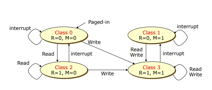 NRU: 리눅스에서 실제로 사용되고 있는 방식이다. Reference bit와 함께 modify bit를 사용해서 4가지 상태를 가지는 상태 처리도를 기반으로 동작한다. 인터럽트가 발생하면 전부 0으로 초기화하고 Read가 발생하면 R(Reference bit)를 1로 바꾼다. Write가 발생하면 M(Modify bit)를 1로 바꾼다. Class 0은 접근이 이루어지지 않은 가장 우선순위가 낮은 페이지이고 Class 1은 Write만 이루어진 페이지이다. Write 작업보다 Read 작업이 계속되는 경우가 많으므로 Write보다 우선순위가 높다. Class 2는 Read만 이루어진 페이지이고 Class 3은 둘 다 이루어진 페이지이다. 3이 가장 replace될 가능성이 낮다. PTE를 보면 Valid 비트와 함께 Reference bit와 Modify bit를 함께 관리하고 있는 것을 알 수 있다.