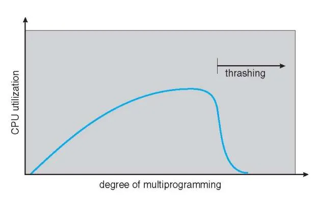 Thrashing: 프로세스 수가 증가할수록 CPU Utilization이 계속해서 증가하다가 어느 순간 급격히 감소하는 현상이다. locality 특성을 가지고 있는 페이지들의 총량이 physical memory보다 커지는 순간 page replacement가 급격히 증가하고 I/O 작업만 계속하면서 성능이 떨어진다. Locality를 가지는 페이지들의 총량이 피지컬 메모리의 양을 넘어서서 I/O만 계속해서 발생하는 상황이다.