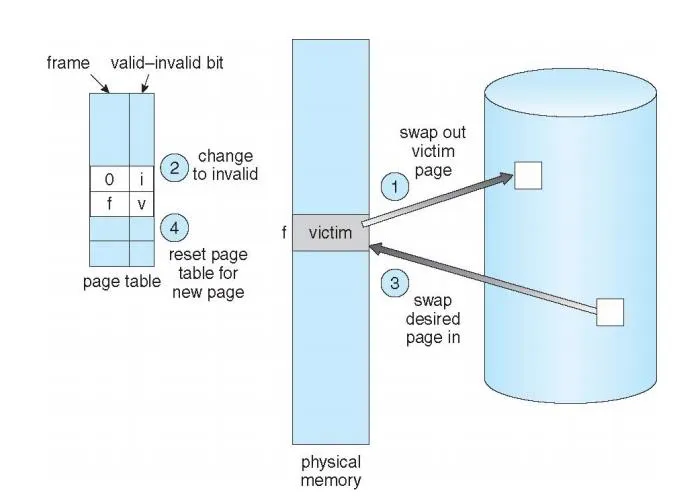 개념: logical memory에서는 프로그램이 실행되려면 메모리로 프로그램이 전부 다 올라온다고 가정하지만, 실제로 virtual memory를 적용하면 처음 수행할 때는 아무것도 피지컬 메모리에 올리지 않고 수행한다. CPU가 TLB 혹은 메모리에 존재하는 페이지 테이블을 통해 특정 메모리 영역을 접근했는데 플래그가 invalid 상태이면 그때 피지컬 메모리에 올린다. 처음 프로세스가 실행되면 페이지 테이블이 생성되고 전부 invalid인 상태로 시작한다. 특정 페이지를 참조했는데 invalid이면 exception으로 인해서 인터럽트를 발생시키고 운영체제를 호출하며, 인터럽트 핸들러가 protection 문제로 인한 invalid 상태인지 (not in memory) secondary storage에 존재하는 것인지 (page fault) 판단한다. 만약 page fault라면 디스크에서 페이지를 가져와서 메모리에 올린다. Protection 이슈라면 운영체제가 kill한다. context switching 이후 최초 한번은 반드시 page fault가 발생한다. 요청이 있을 때 필요한 부분만 피지컬 메모리에 올리기 때문에 Demand Paging이라고 부른다. 만약 피지컬 메모리에 free frame이 없으면 피지컬 메모리에 있는 특정 페이지를 디스크로 내려야 한다. 디스크의 어느 공간에 프로그램이 존재하는지는 PCB에 base 주소가 기록되어 있다. Invalid일 경우 PCB를 참조해서 디스크에서 가져와서 로드한다. 따라서 특정 디스크 영역이 정해진 것이 아니라 디스크 영역 전체가 가상 메모리처럼 사용되는 것이다. 하지만 용량의 한계는 정해져 있어야 한다.
