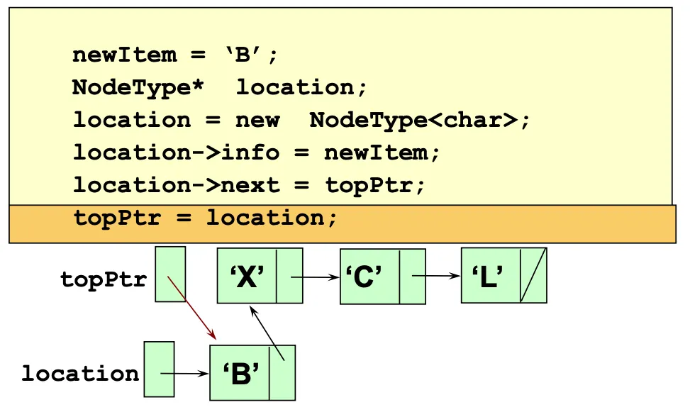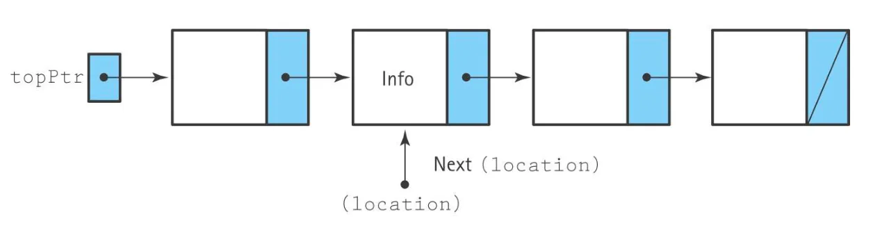 topPtr는 head라고도 하며 연결 리스트의 시작점을 가리킨다. 리스트가 비어있다면 헤드는 nullptr를 가리킨다.