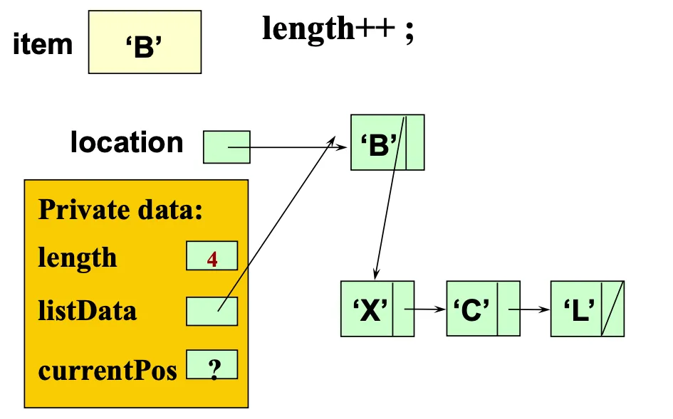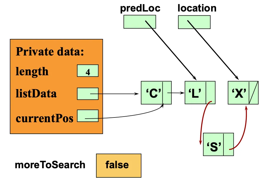 solution: predLoc과 location의 두 개의 포인터를 사용해서 새 element를 삽입할 위치를 찾는다.