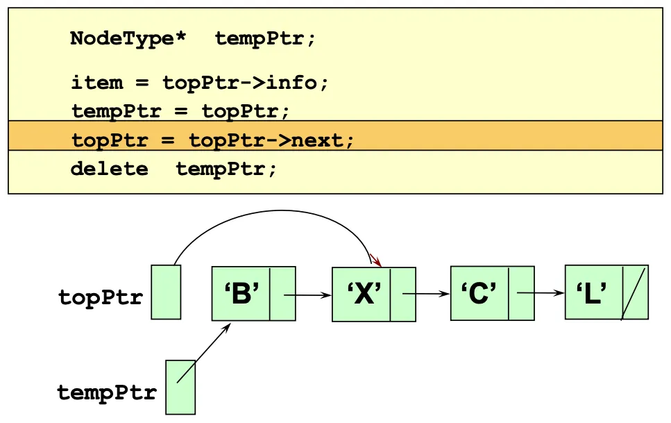 delete topPtr; 한다고 해서 topPtr이 가리키고 있는 모든 노드들이 해제되지는 않는다. while문을 통해서 순회하면서 하나씩 해제해줘야한다.