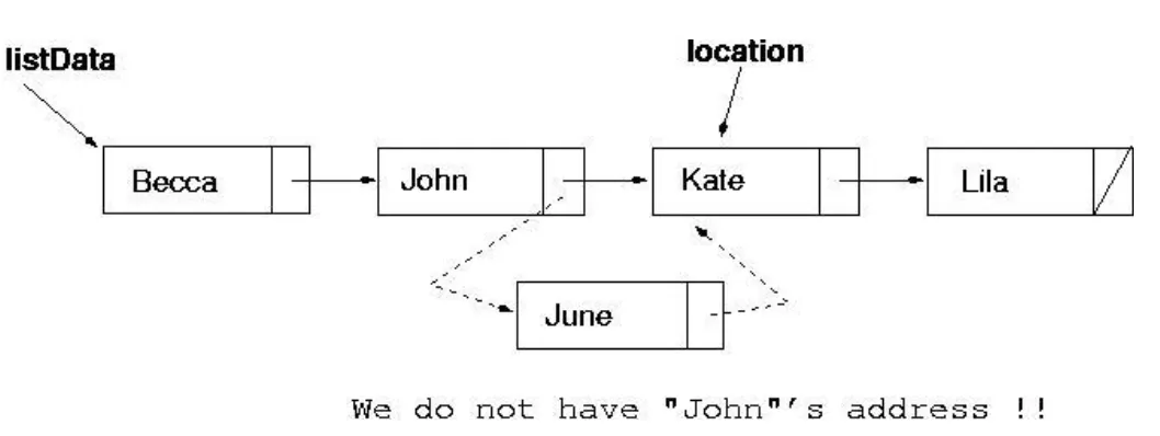 Kate 앞에 들어가야한다는 것을 알게 됐을 때, John의 next가 June을 가리켜야 한다. 하지만 John의 address가 없으므로 변경할 수 없다. location이 가리키고 있지 않기 때문.