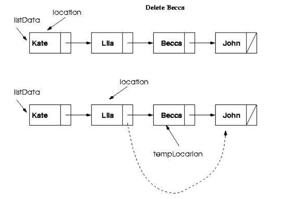 (location→next)→info로 접근해서 item을 찾는다. 앞선 칸에서 다음 칸에 찾는 item이 있는지 확인하는 것이다. 첫번째 칸을 지워야 하는 경우는 예외처리해준다.