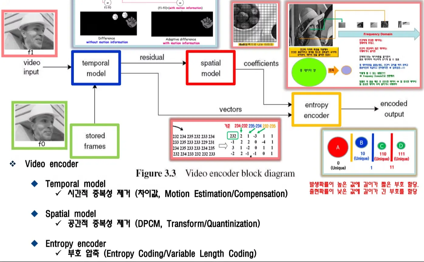 video input으로 f1 영상이 들어오면 temporal model에서 저장되어있던 이전 프레임인 f0을 활용해서 motion estimation과 motion compenstation을 이용해서 시간적 중복성을 제거하고 residual(차영상)을 spatial model로 보내주고, motion vector는 entropy encoder에 보내준다.