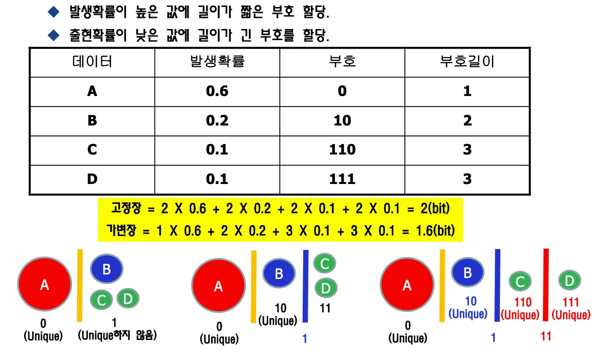 확률적 편중을 이용해서 많이 나오는 케이스에는 데이터를 줄여서 보낸다. 부호의 발생확률이 높은 심볼들의 이름을 짧게해서 보내고 발생확률 낮은 심볼은 긴 이름 붙여도 큰 차이가 없다 = VLC(variable length coding)
