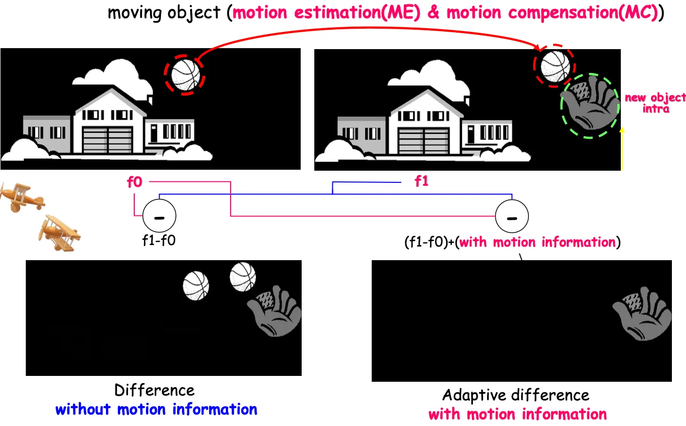 예를 들어 모양은 똑같은 야구공이 위치만 변하면 야구공의 움직임벡터와 두개의 영상의 차(residual)을 보내줘서 구현한다.