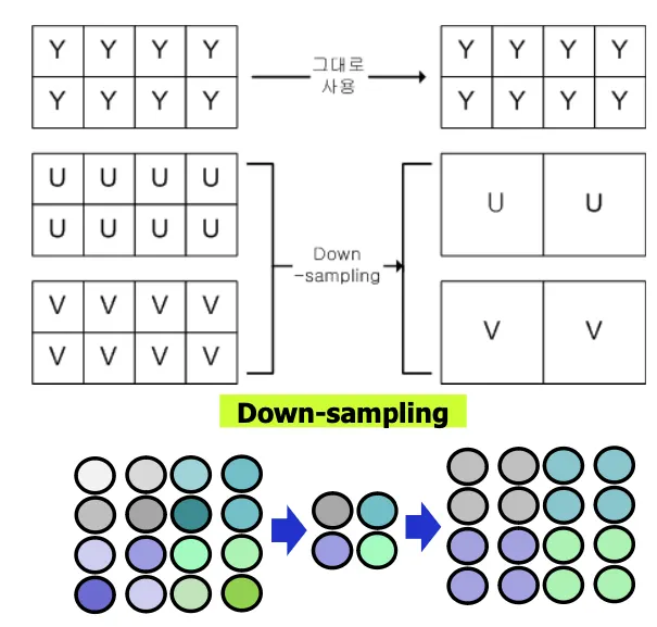 u,v데이터 줄이려면 다운샘플링으로 4개를 하나로 만들고 rgb로 만들때 다시 업샘플링하면 된다