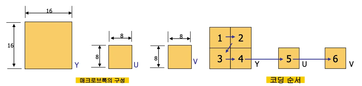 y는 4개의 8x8블록으로 이루어지며 이를 매크로블록이라고 부름.