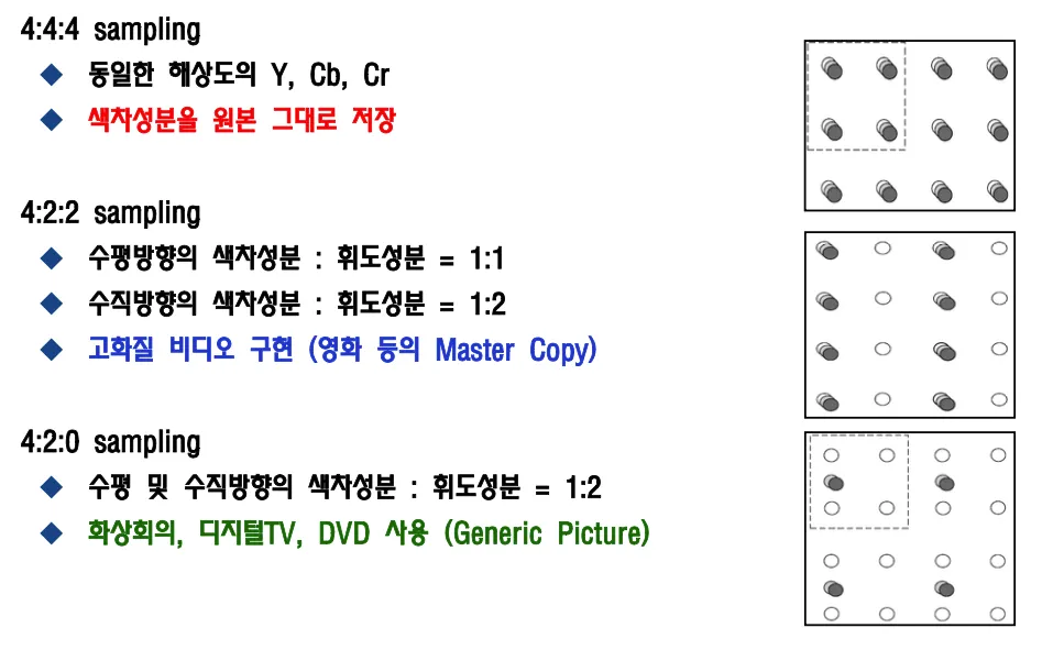 인간은 색차정보에 둔감하므로 정확하게 재현할 필요가 없고 색차정보의 정보량을 줄이기 위한 기법