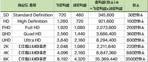 UHD의 경우도 rgb각 색상을 10비트로 표현해서 30비트를 사용하기도 한다. 따라서 10억개의 색상을 표현가능.