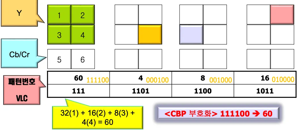 CBP(coded block pattern)은 이전 화면의 같은 위치에 있는 매크로블록에 변화가 있었음을 보이는 것으로, 6개의 블록 중에서 적어도 한개의 변환계수가 전송되는 블록이 있는 경우 사용됨.