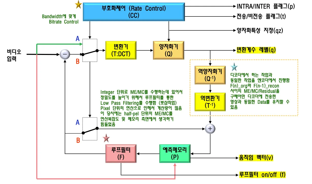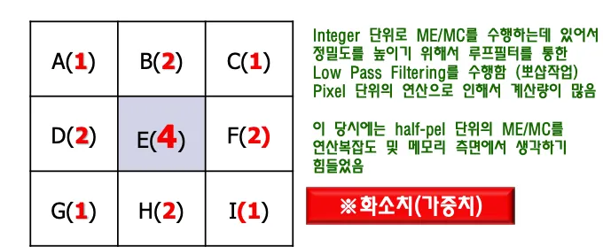 루프필터 ⇒ integer단위로 ME/MC 수행하는데 정밀도를 높이기 위해서 루프필터를 통한 low pass filtering을 수행한다. half pel단위의 ME/MC를 적용하기에는 당시에 개발할때 연산복잡도, 메모리 측면에서 구현할 수 없었다. 매크로블록 단위마다 루프필터를 on off하도록 설계함