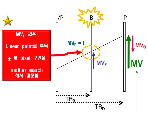 B-frame이 아니라 B-vop이다. 코딩효율의 향상을 위해서 양방향 예측을 사용한다. I-VOP 혹은 P-VOP간의 비례에 의해서 B-VOP을 자동으로 계산한다(Linear의 경우). Linear일 경우에는 자동계산되므로 MV값을 보내지 않고 Linear가 아닐 경우 MV의 보정을 위해서 delta값을 인코더에서 보낸다.
