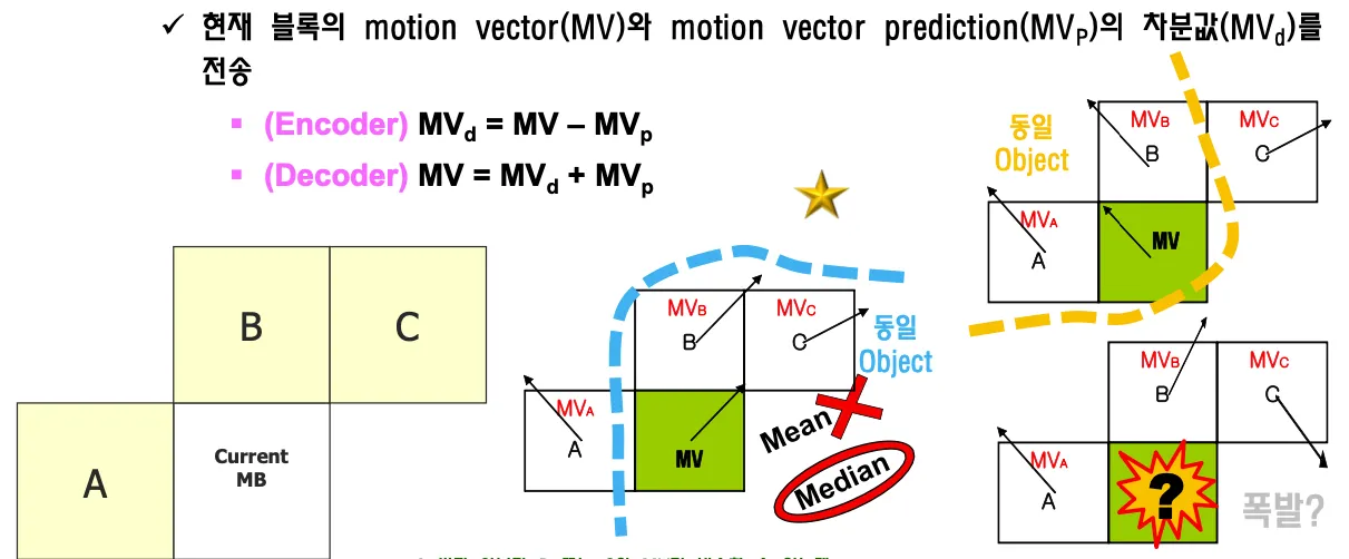 H.261, MPEG-1에서는 a로부터만 가져오기로 약속했지만 그러면 코딩 퍼포먼스가 떨어진다. 그렇다고 모드정보를 보내면 정보량이 늘어난다. 그래서 이걸 탈피하기 위해서 a,b,c 의 median 값을 보낸다