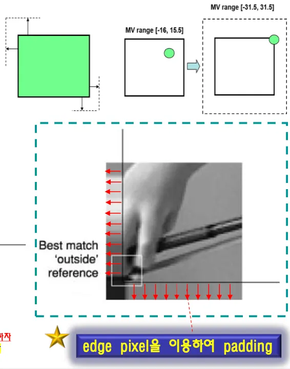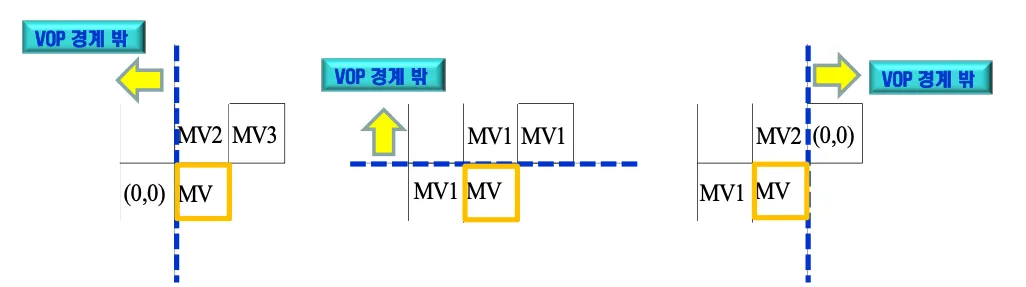 VOP경계 밖은 주변 블록이라도 믿지 않는다. (0,0)으로 처리하거나 사용할 수 있는 값을 median으로 사용