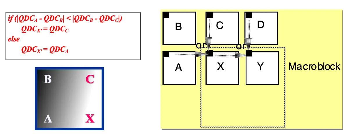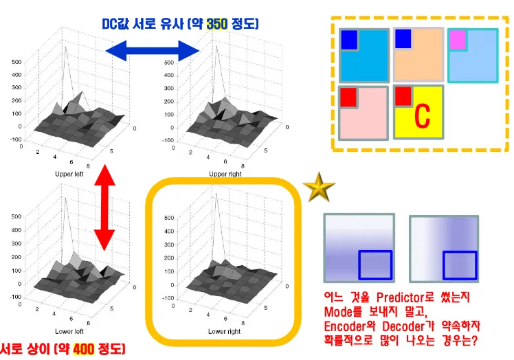 DC coefficient를 보낼 때 예측을 통해 데이터를 줄인다. 주변 데이터와 유사하므로 값이 0을 중심으로 라플라시안 형태로 모이므로 어디랑 비슷한지 predictor를 이용해서 데이터를 줄일 수 있다. 하지만 어디와 비슷한지 mode를 보내면 데이터가 늘어나므로 인코더와 디코더가 누구를 predictor로 쓸지약속해서 모드정보를 보내지 않고 처리하도록 한다.