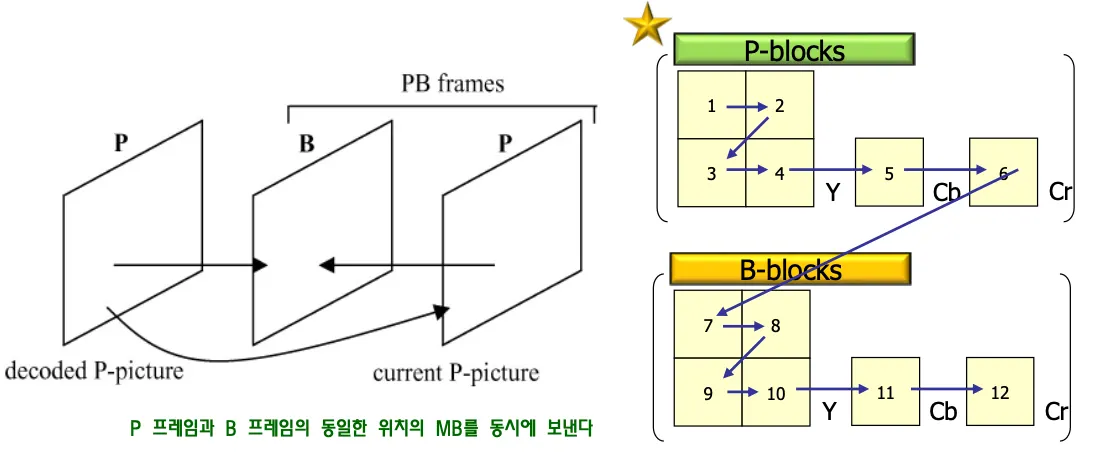 두개의 픽쳐 p와b를 하나의 유닛으로 코딩한다. 한개의 매크로 블록에 12개의 블록이 들어간다.p프레임과 b프레임의 동일한 위치의 MB를 동시에 보낸다.