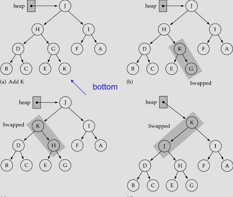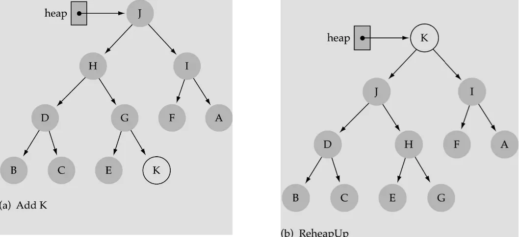 ReHeapUp: InsertItem 수행시에 사용됨. 삽입된 노드가 부모노드와 비교하여 적절한 위치로 올라감.