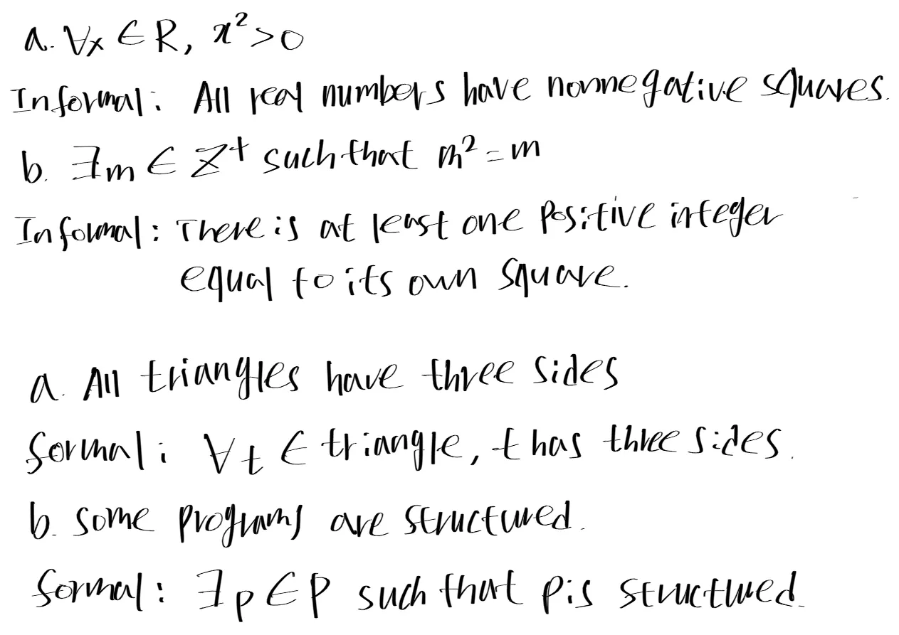 all, every등의 단어를 포함하지 않아도 articla a로 인해서 묵시적으로 universal quantification의 의미를 포함한다. ex) If x > 2 then x² > 4 ⇒∀ real numbers x, if x > 2 then x2 > 4.