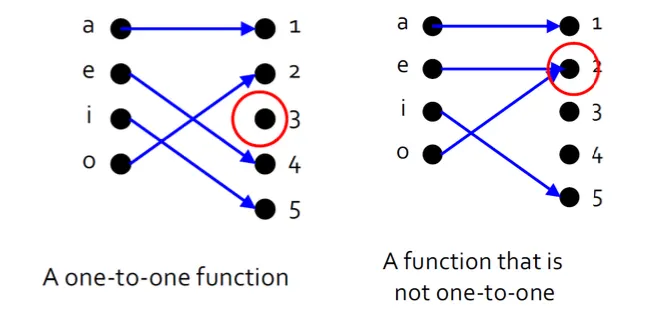 하지만 정의역의 2개의 화살표가 공변역에서 같은 원소에 대응되지 않으면, 그러한 함수를 일대일 또는 단사