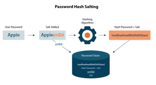 비밀번호를 salt와 함께 hashing 알고리즘을 통해 해싱하고 그것을 서버에 저장한다.