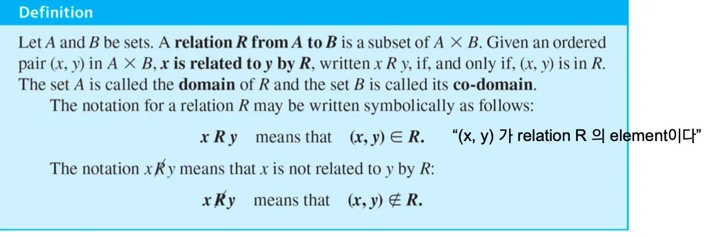 관계 = 주어진 조건에 의해 관계가 있는 원소들의 순서쌍 모두의 집합.