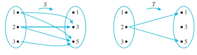 For every (x, y) ∈ A × B, (x, y) ∈ S means that x < y, T = {(2, 1), (2, 5)}.