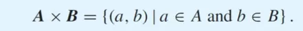 A X B = A cross B = 순서쌍 (a, b)의 가능한 모든 경우의 집합. (a는 A의 원소, b는 B의 원소)