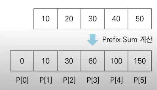 접두사 합(prefix sum)을 활용: 맨 앞부터 특정 위치까지의 합을 미리 구한 배열