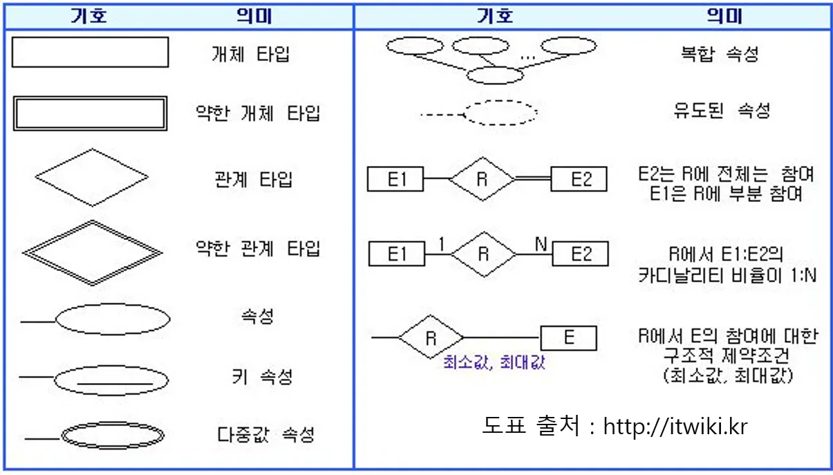 관계는 마름모 약한 개체는 이중 사각형, 약한 개체가 맺는 관계는 이중 마름모로 표기하고, 선택적 참여는 실선, 필수적 참여는 이중선으로 표현