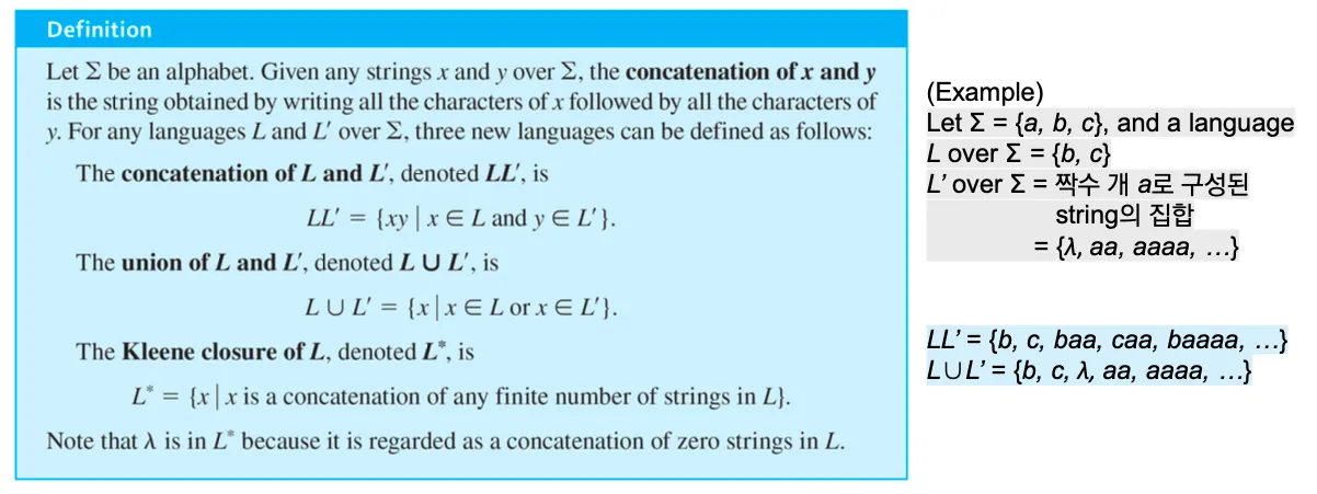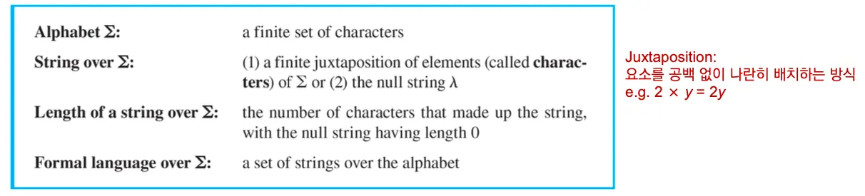 (알파벳상의 formal language, 형식언어. 형식언어: 특정한 법칙에 따라 구성된 문자열들의 집합)